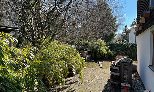 Rund um das Wohngebäude befindet sich der Natur-Garten mit Sträuchern und Bäumen. Im Gartenhaus können gebührenfrei eBikes geladen und Fahrräder abgestellt werden.